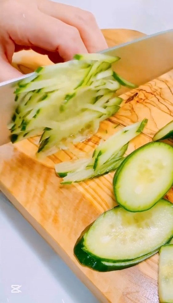 木のまな板の上で均等に切られていくキュウリは、見た目からもシャキシャキの食感が伝わってくるようです!