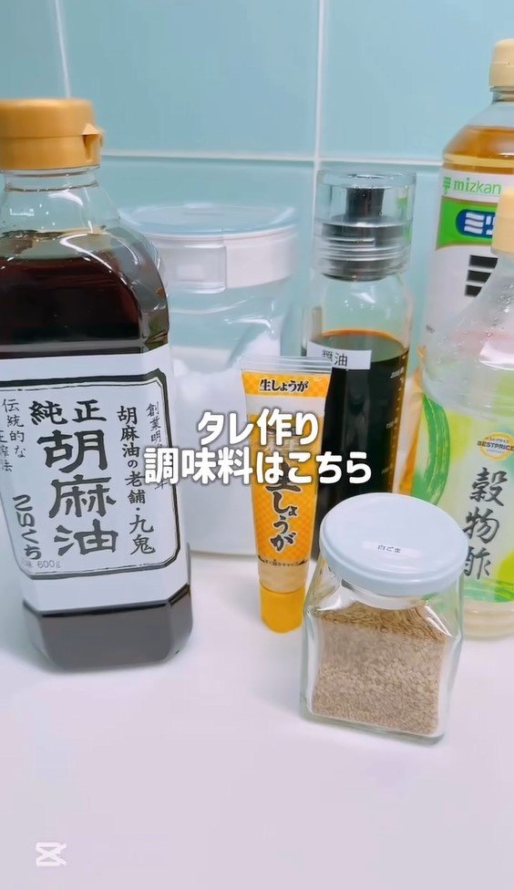 調味料はお酢、砂糖、しょうゆ、ごま油、おろしショウガ、いりごまを準備し…
