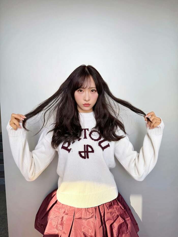 室内で撮影された写真では、両手で長く黒い髪を左右に引くようなポーズをとり、きゅるんとした瞳でこちらを見つめる姿を披露!唇をすぼめる愛らしい表情に思わずドキッとさせられます。