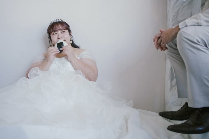 そして、ドレス姿で座り、おにぎりを口元に持つ餅田さんと、旦那さんが腰掛ける様子を捉えた写真も披露!