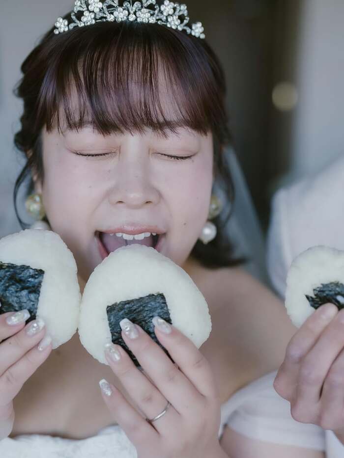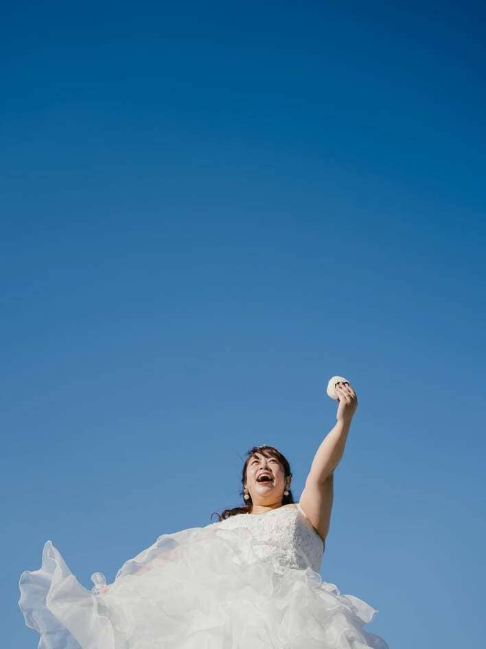 そこには、青空バックに純白のウェディングドレス姿でおにぎりを片手に掲げた姿が!下の角度から撮影され、青く澄み渡る綺麗な青空と、チュール素材が際立つドレスのコントラストが映えた1枚に仕上がっています。