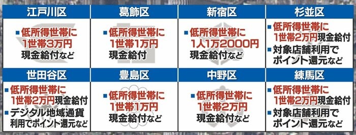 江戸川区、葛飾区、新宿区、杉並区、世田谷区、豊島区、中野区、練馬区