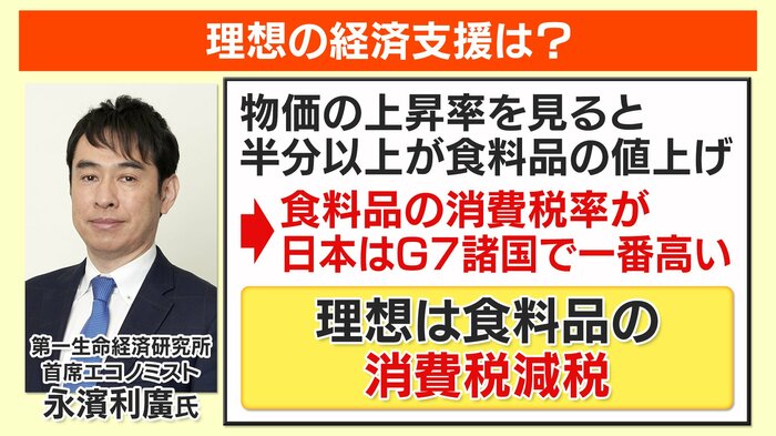 第一生命経済研究所・首席エコノミストの永濱利廣氏によると、物価の上昇率を見ると半分以上が食料品の値上げであり、食料品の消費税率が日本はG7諸国で一番高いことから「理想は食料品の消費税減税」という意見が聞かれました。