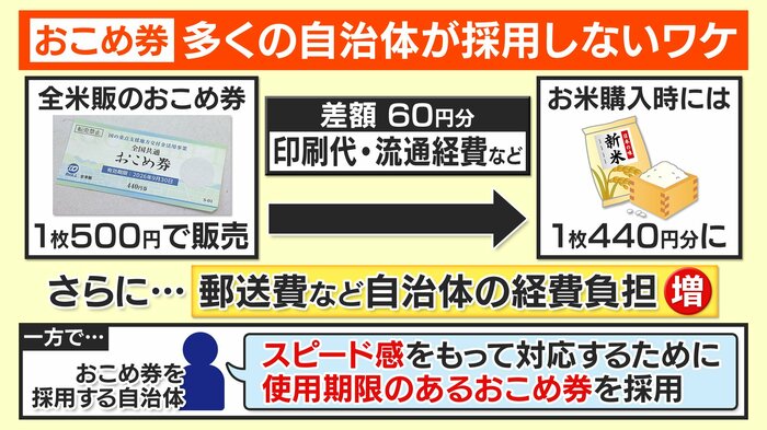 一方で、おこめ券を採用する自治体は「スピード感をもって対応するために使用期限のあるおこめ券を採用する」としています。