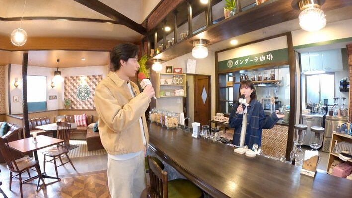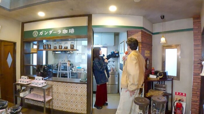 まずは、濱尾さんがガンダーラ珈琲の中へ。このセットにはあまり来たことがないということで、助っ人として福本さんが登場。「いらっしゃいませ!」と、濱尾さんを明るく出迎えました。