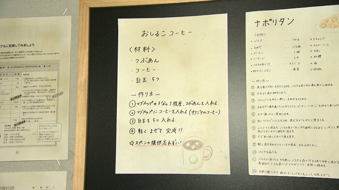 濱尾さんが「このセットのお気に入りポイントは?」と聞くと、福本さんは厨房へ入り、壁に貼ってあるレシピを指しました。「おしるこコーヒーです。チェンさん(肇)が毎回頼むメニューで、おしることコーヒーが一緒になっています。ここの看板メニュー」と紹介しました。