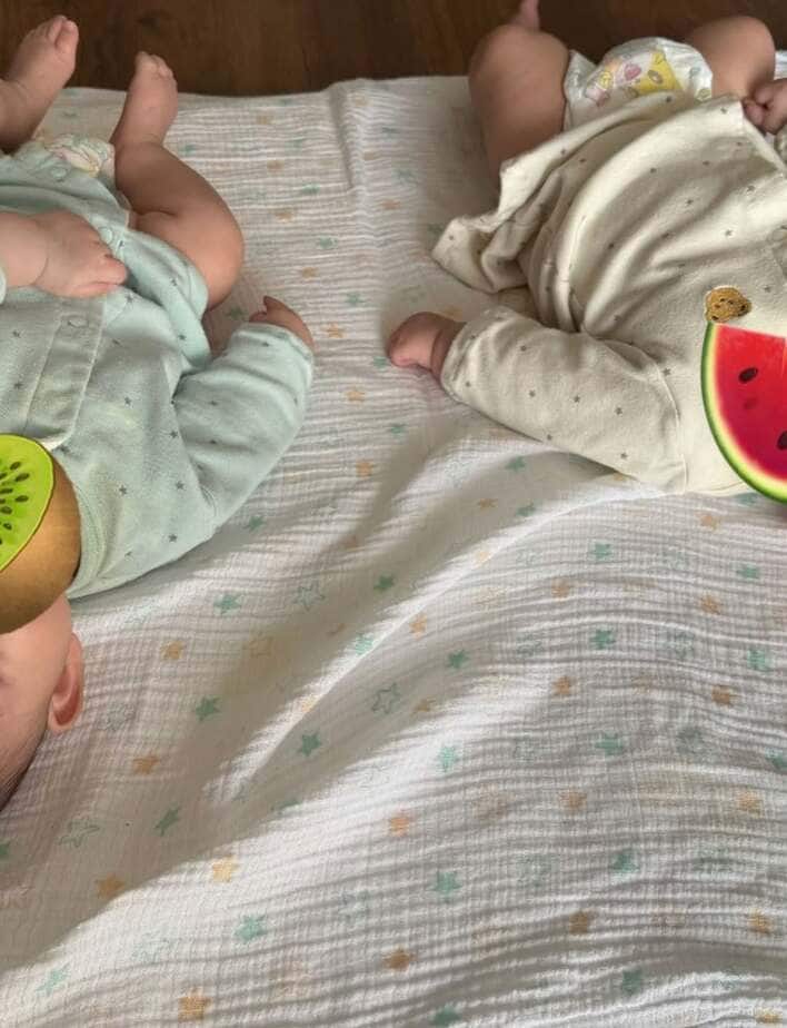きょとんとしたような表情を浮かべる、双子たちのつぶらな瞳がなんともかわいらしいですね。