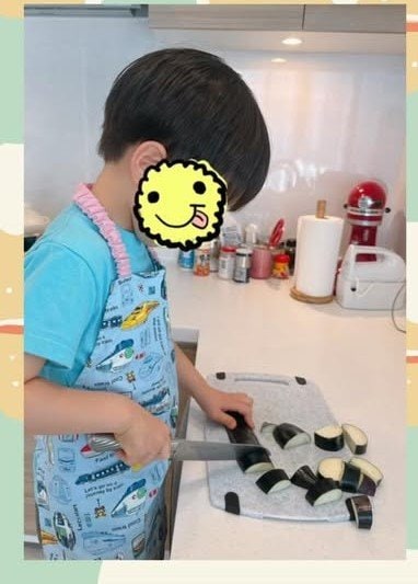 まずは、野菜をカット!ナスを包丁で半月切りにカットしています。包丁をうまく使いながらカットしていて、5歳とは思えないほどの包丁さばきに、ついつい見入ってしまします。