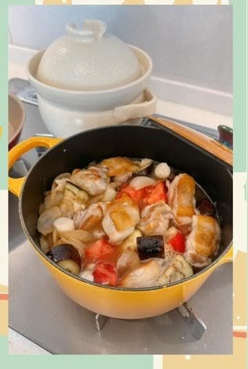 鍋には、焦げ目が付いた鶏肉や、ナス、トマトなどゴロゴロとした具材が煮込まれています。