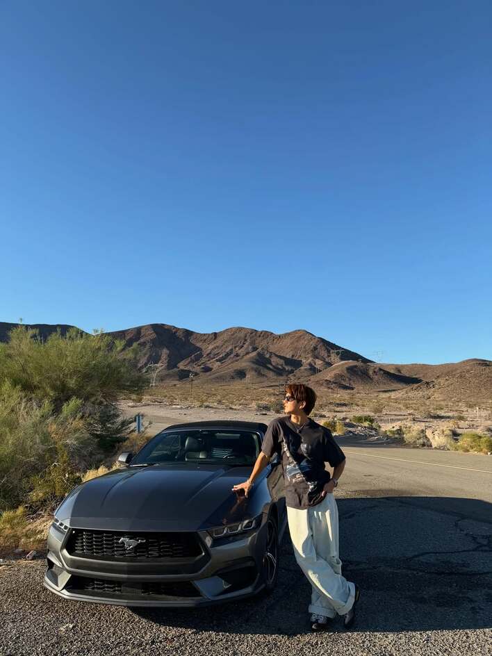 公開された写真には、光沢のあるグレーのフォード・マスタングに寄りかかり、遠くの景色を見つめる大倉さんの姿が。濃いグレーのTシャツに淡い色のボトムス、黒いサングラスを合わせたカジュアルな装いで、アメリカの広大な自然に溶け込んでいる様子が切り取られています。