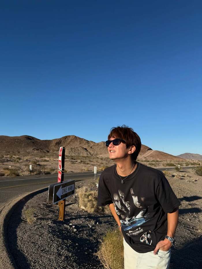 どこまでも続くかのような一本道と果てしなく広がる砂漠の中、「ONE WAY」の標識の前で手をポケットに入れたまま前かがみになり、楽しげに微笑む一枚も披露しました。強い日差しを浴びる姿から、現地の開放的な空気が伝わってくるようです。