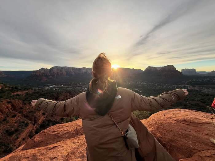 背景には、荒々しさの中にも荘厳さを感じさせるセドナの稜線から、朝日が顔を出す壮大な光景が広がっています。