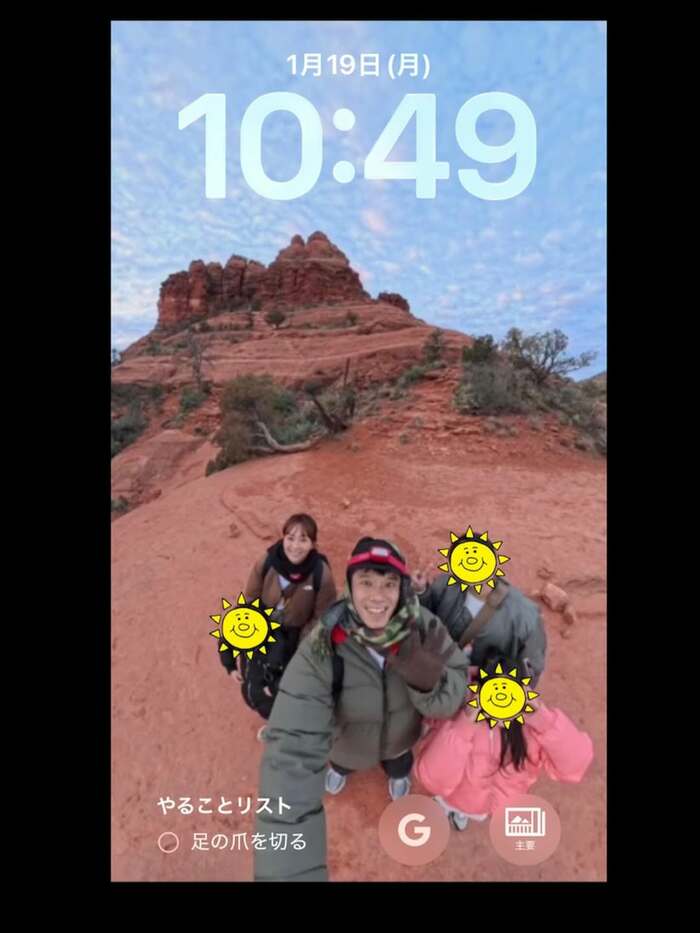 投稿では、セドナの山を背景に、家族5人ショットを待ち受けにしている画像を披露。長男はピースサイン、長女はほっぺハートポーズを見せており、楽しげな雰囲気が伝わってきます。
