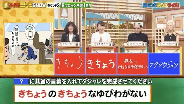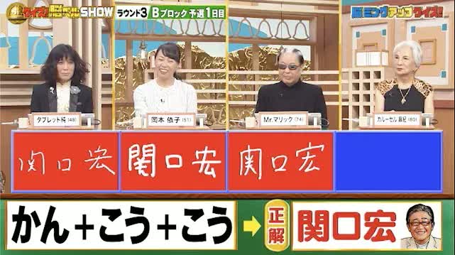 今回の解答者は、歌手・芸人のタブレット純さん(48)、元テコンドー選手・岡本依子さん(51)、超魔術師・Mr.マリックさん(74)、タレント・カルーセル麻紀さん(80)の4名です。