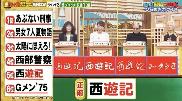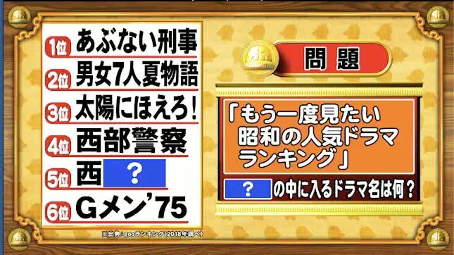 最後は、日常ランキングの問題。「もう一度見たい昭和の人気ドラマランキング」、「?」の中に入るドラマ名をお答えください。