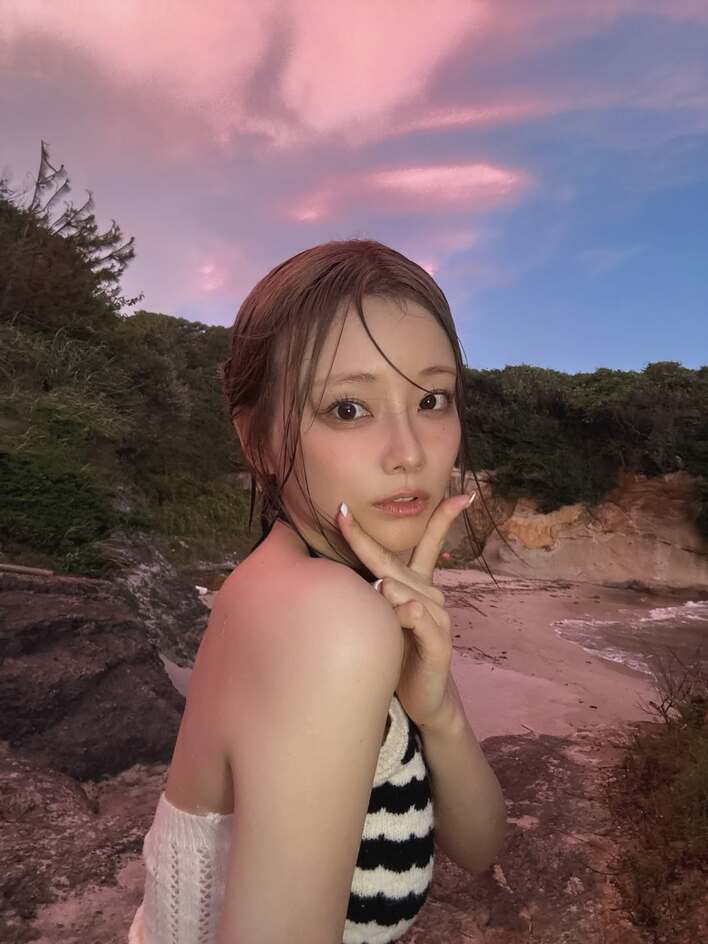 さらに、夕日が沈む時に撮影された海辺ショットも披露した重盛さん。