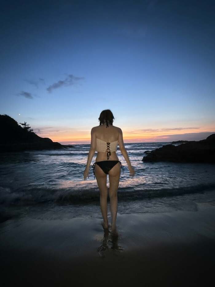 引き締まった背中など、美ボディーぶりがあらわなった1枚で、夕日も相まって写真集のようなカットになっていますね。