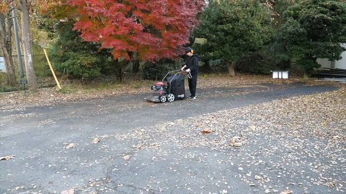 この日は、エンジンバキュームを使って落ち葉掃除をするようです。
