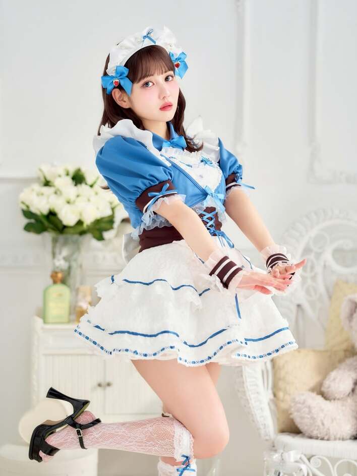 さらに、背を向け、静かにたたずむショットも披露!後ろ姿からも伝わる衣装の精巧なデザイン、特に背中でクロスするリボンやスカートのフリルが印象的で、360度どこから見ても完璧な可愛さを証明しています。