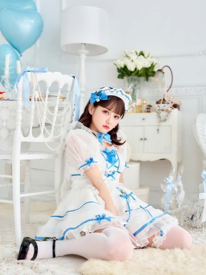 白を基調とした可愛らしい家具が並ぶスタジオで、白いメイド風の衣装を身に着け床にペタッと座り込む佐藤さん。体を少し前に傾け、カメラをじっと見つめるその淡い視線が非常に印象的です。ドレスにはフリルとリボンがあしらわれ、水色の縁取りが鮮やかなアクセントになっています。
