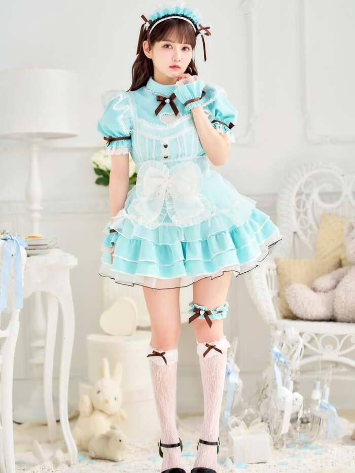 また、左手をそっと頬に添えたショットでは、ミントグリーンの衣装に身を包んだ佐藤さんが、やわらかな存在感を放っています。ミントグリーンのカチューシャやガーターリング、腰元にあしらわれた白レースの大きなリボンなど、甘ロリ系の装飾が佐藤さんの雰囲気を一層引き立てています。