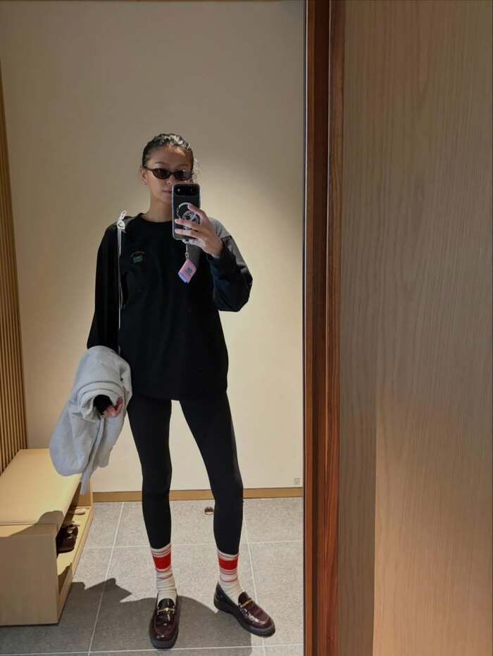 サングラスをかけた榮倉さんは、黒いトレーナーに、脚線美が際立つトレーニングパンツを身につけています。足元は、白のソックスに焦げ茶のローファーを合わせた、スタイリッシュな装い。