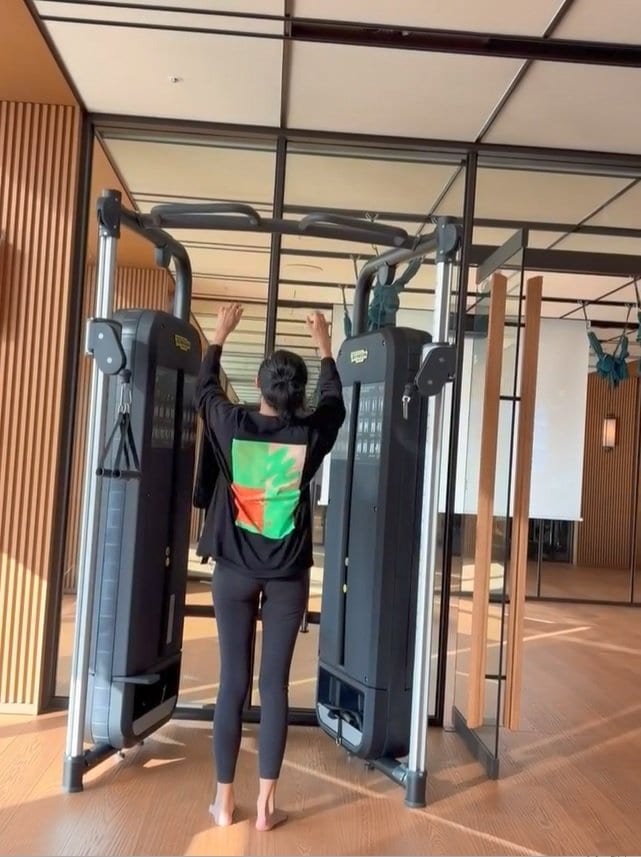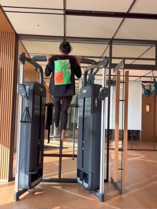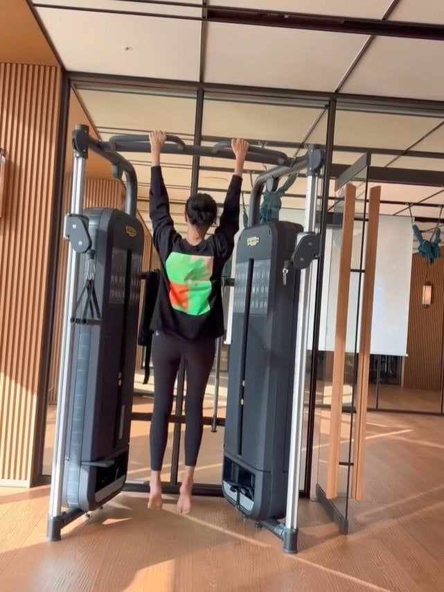 懸垂を行うようで、お団子にした髪に裸足と、やる気十分の様子が伝わってきます。