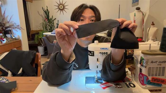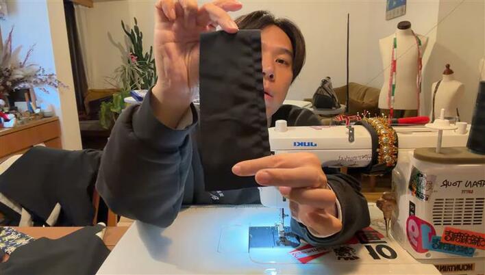 ここでコカドさんが頭を悩ませるのが、縫った際に生地が波打ってしまうこと。100%ナイロン生地を使うため、試し縫いの際に波打ちしたそうで、視聴者のアドバイスでサブテンションの強さを調整したり、押さえの種類を変えたりと、試行錯誤していきます。