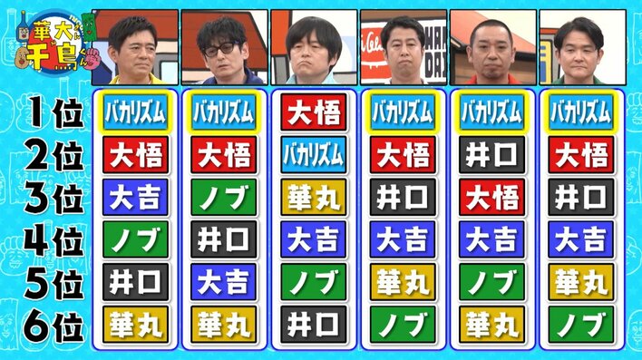 博多華丸さん、博多大吉さん、千鳥(大悟さん、ノブさん)、かまいたち(山内健司さん、濱家隆一さん)さんを含めた8人のうち6人がランキングに参加し、お題に対して全員で順位を予想しました。