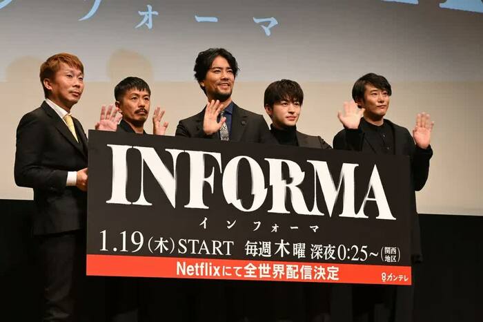 1月14日、『インフォーマ』(1月19日スタート!毎週木曜24時25分~/カンテレ ※関西ローカル)の制作発表・試写会が行われ、桐谷健太さん、佐野玲於さん、森田剛さん、原作・監修の沖田臥竜さん、藤井道人監督が出席しました。
