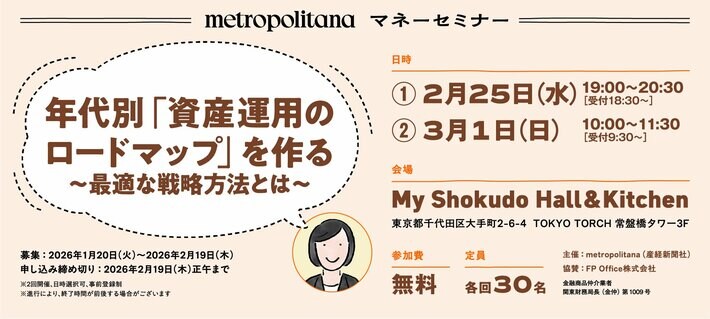 メトロポリターナ(産経新聞社発行)は、資産運用などに興味がある方を対象にマネーセミナー『年代別「資産運用のロードマップ」を作る~最適な戦略方法とは~』を、2月25日(水)19時からと3月1日(日)10時から、カフェラウンジ「MY Shokudo Hall & Kitchen」(東京都千代田区)で開催。参加者を募集します。