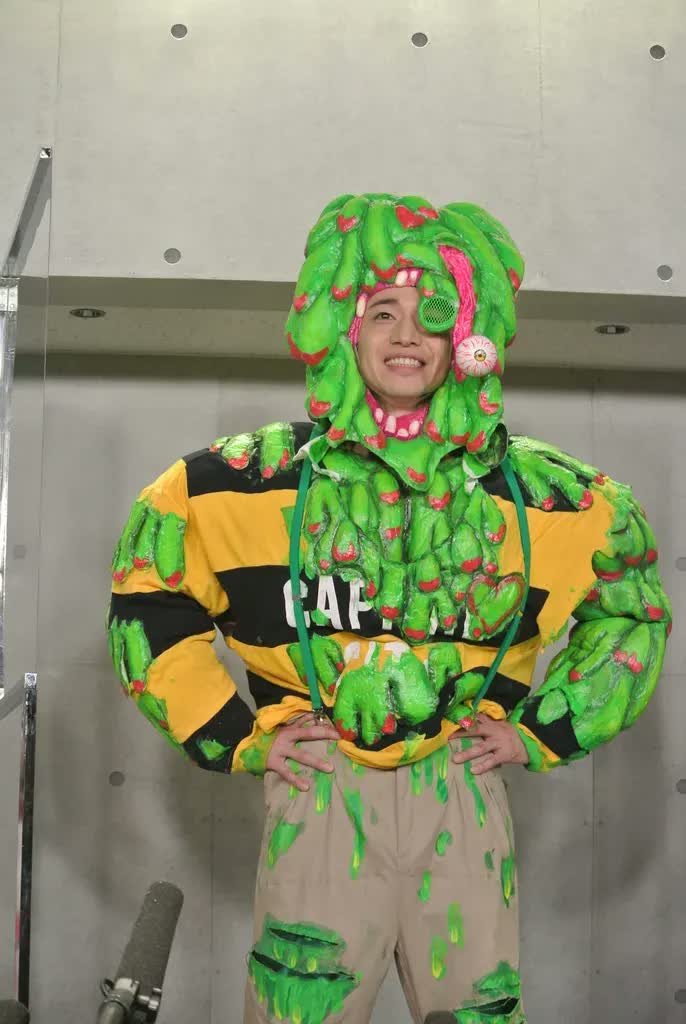 顔が半分隠れた“モンスター”ビジュアルで登壇した福田さんは「見ての通り、普通の舞台です」とジョーク交じりにPRを。