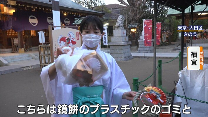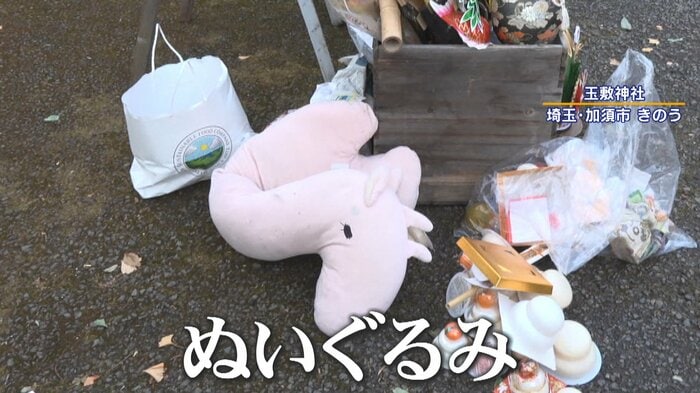 神社では、門松や鏡餅などの正月飾りは引き取らないと説明していますが、1月、放置されていたのは、鏡餅のプラスチックケースが約13個、高さ30cmほどの門松が1つ、熊手が3本。さらに、着物を着た人形やキリンのようなぬいぐるみも。