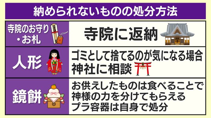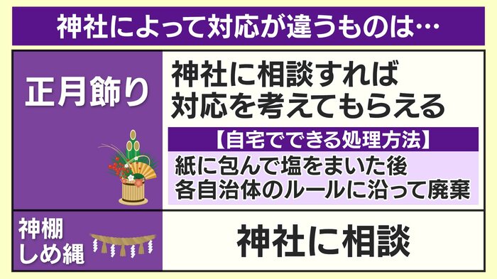 正月飾り、特にしめ飾りは神社によって対応まちまちであります。神社ごとによって様々な事情があって受け入れられないというのがあるんですが、もし受け入れができない神社の地域の方であれば、しめ飾りに塩をまいて清めて紙に包んでから各自治体のルールに沿って処分。しめ飾りは正月に訪れる神様のより代、宿るものという信仰がございます。丁寧に扱って処理をしたいところですので。そういったことも含めてご相談ください。