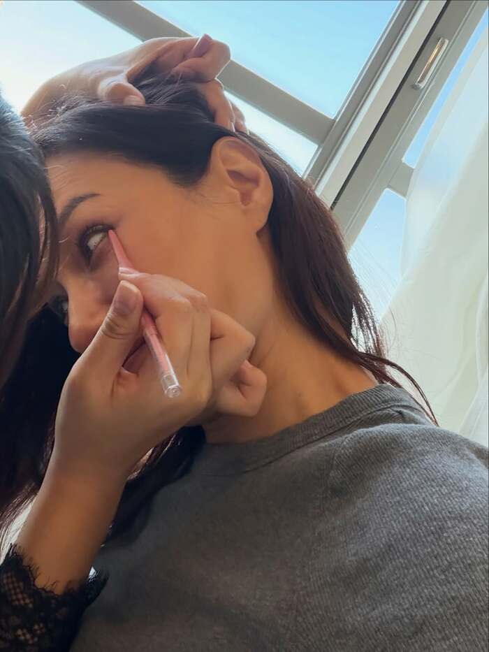 佐田さんも、アイラインが引きやすいように目をしっかり開けて視線をそらし、されるがままにメイクをサポートする様子が伝わってきます。