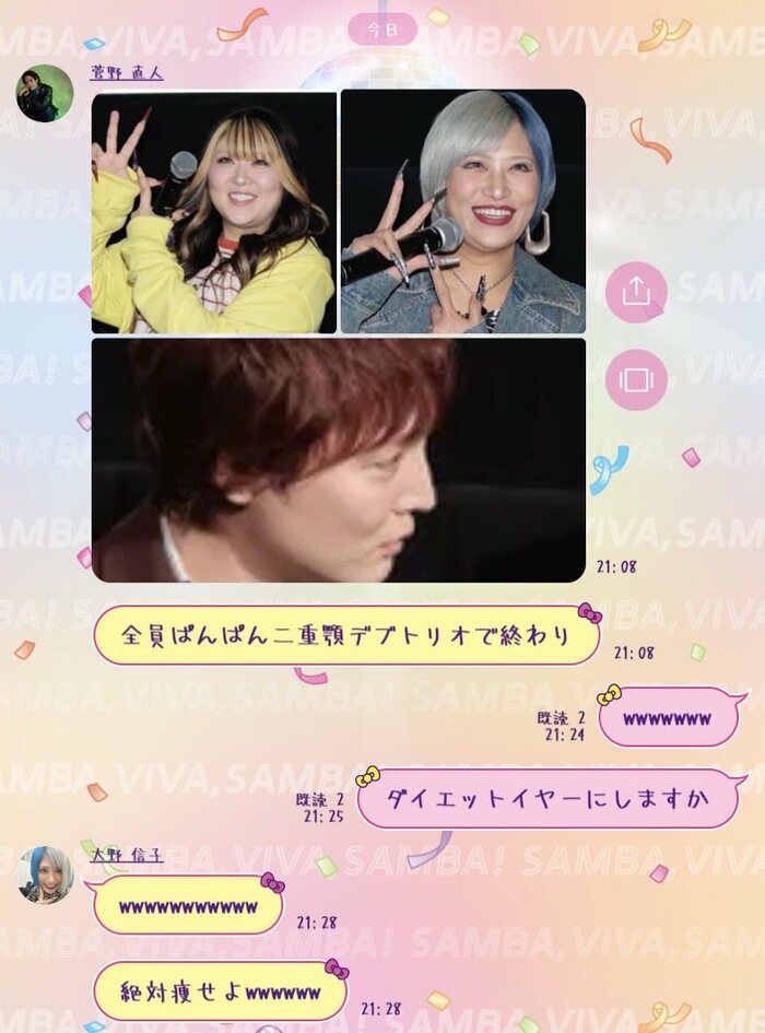 “菅野直人”さんから始まった「全員ぱんぱん二重顎デブトリオで終わり」というトークに、きょんちぃさんは「wwwwwww」「ダイエットイヤーにしますか」と返信。