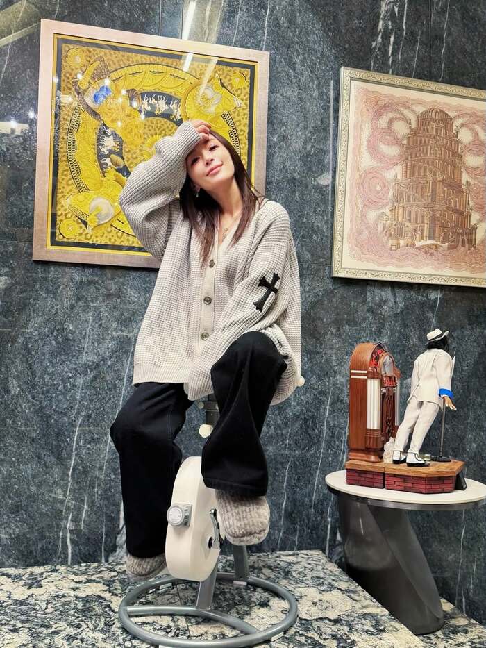 さらに、おしゃれな丸テーブルにはマイケル・ジャクソンの置物が飾られており、そんな空間でマシンに座って髪をかき上げるしぐさをする浜崎さんの姿は、とっても絵になりますね。
