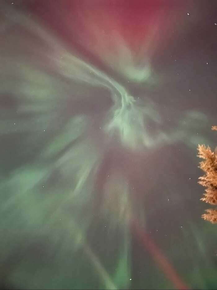厚手のダウンを羽織った福士さんの後ろには、赤と緑が混じり合った巨大なオーロラが!写真におさまりきらないほど広範囲にわたっています。