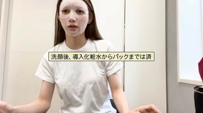 まず洗顔後と導入化粧水を済ませているところからスタートした後藤さん。あまり見ることのできないパック姿も披露しています。