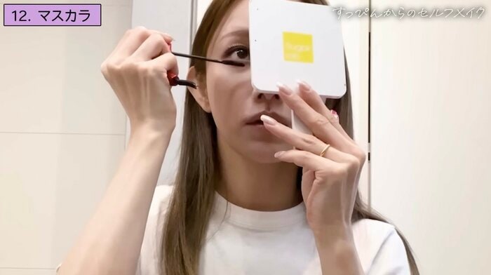 ビューラーでまつ毛をしっかりと立ち上げてから、一本一本を意識しながら丁寧にマスカラを重ねていきます。ナチュラルでありながらも、目元の存在感を引き出す仕上がりが印象的です。