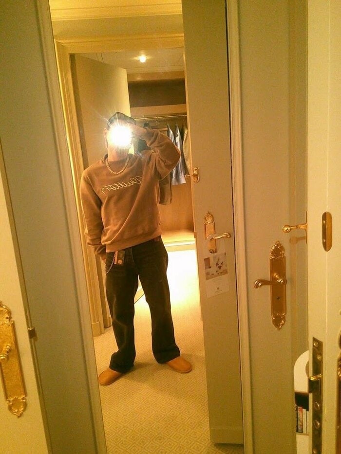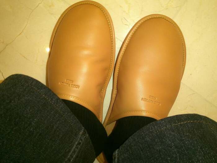 さらに、足元を写したショットも公開。ベージュのスリッパをよく見ると、甲の部分にもルイ・ヴィトンのロゴがあしらわれています。