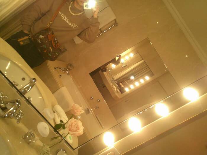 写真には、花瓶に一輪挿されたバラと、ライトがたくさん付いたラグジュアリー感あふれるバスルームで自撮りショットを撮影する平野さん。