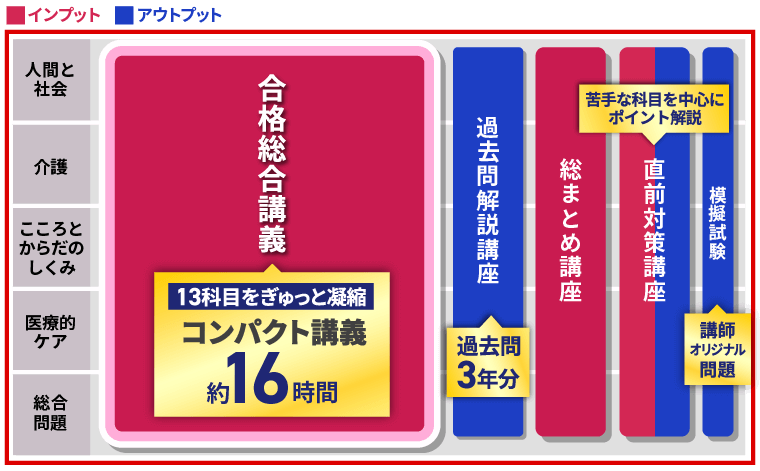 講師の経験や出題分析をもとに、重要論点や出題可能性の高い部分をピックアップし、出題範囲が広い介護福祉士国家試験の出るところだけを押さえたメリハリのある講義になっています。
