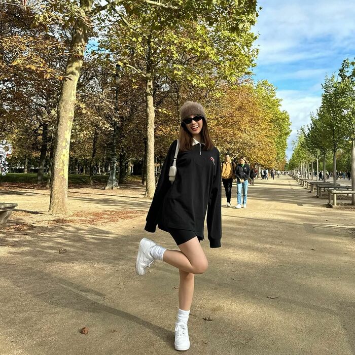 9月30日には木々が紅葉した秋らしいスポットへ訪れたショットを公開!ニットの帽子をかぶり、黒のミニ丈ワンピースにショートパンツ姿で、美脚を披露しています。