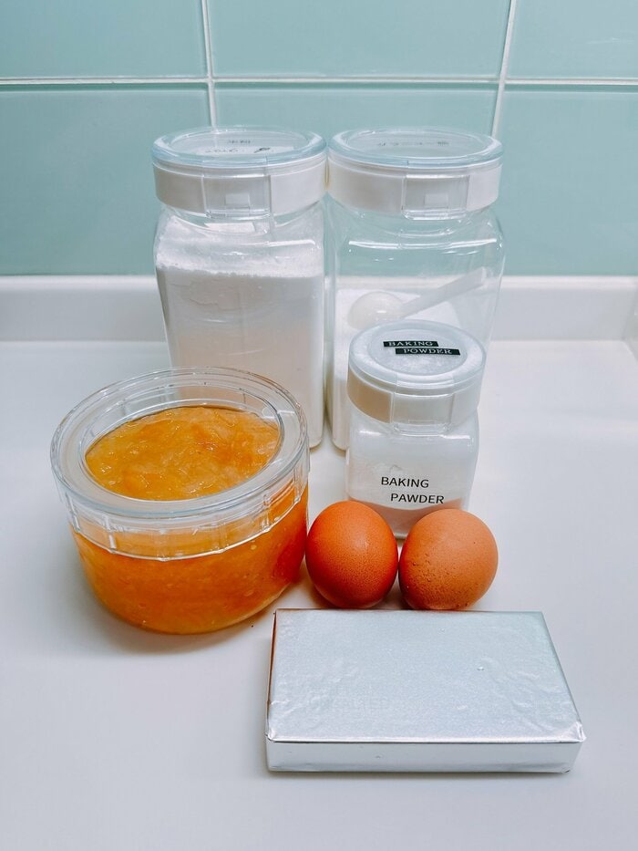 他にも、ベーキングパウダーや卵2個、バターなどお菓子作りの定番材料が置かれています。