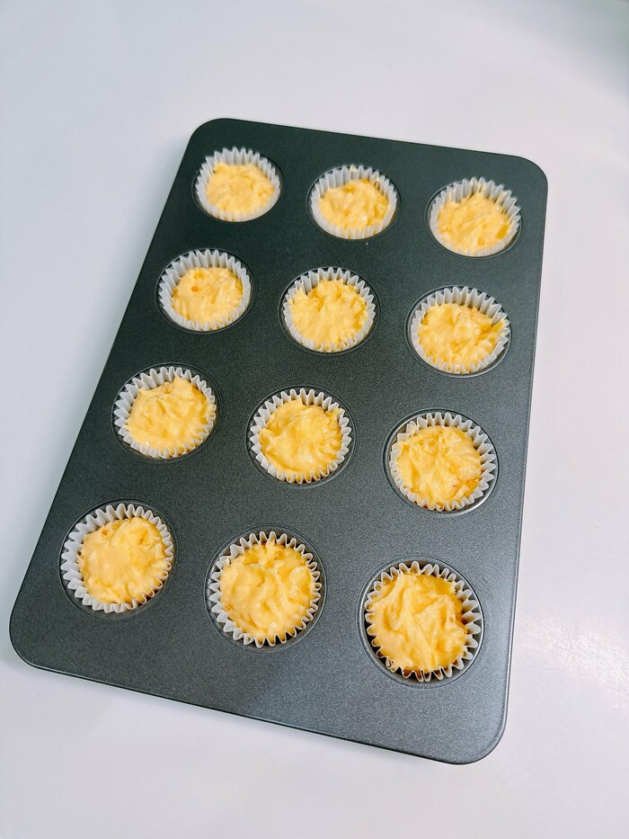 そして、12個一気に作れるカップケーキの型に丁寧に流し込みます。