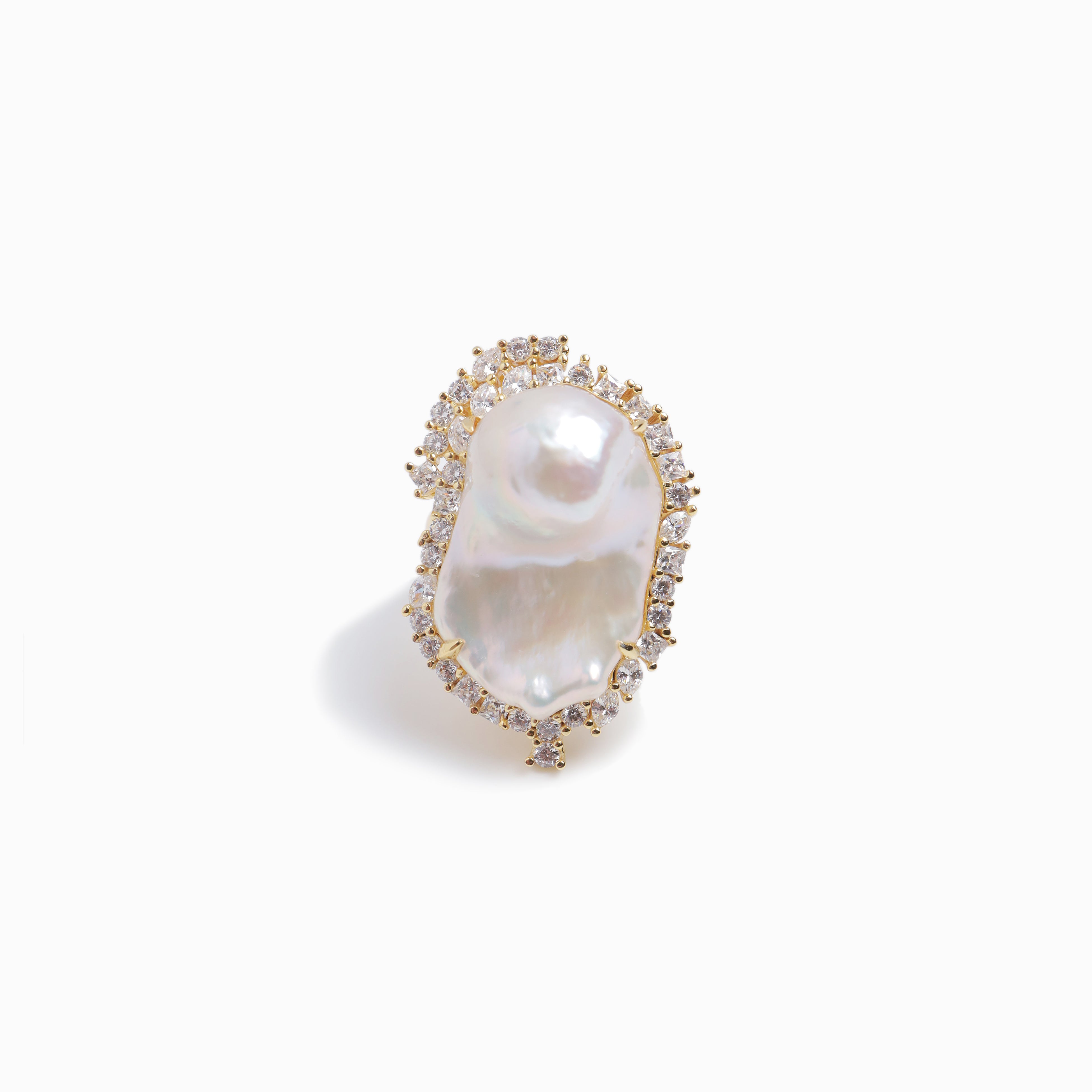 手元に視線を集める、存在感のあるデザインが魅力のリング。大振りのバロックパールを主役に、周囲へランダムに配置したキュービックジルコニアが、奥行きのある表情を生み出します。一点でコーディネートが完成するキャッチーさと、ラグジュアリーなムードを併せ持ったデザイン。同じ形がひとつとして存在しないバロックパールならではの抜け感が、フォーマルにも、あえてシンプルな装いのアクセントとしても映える一本です。