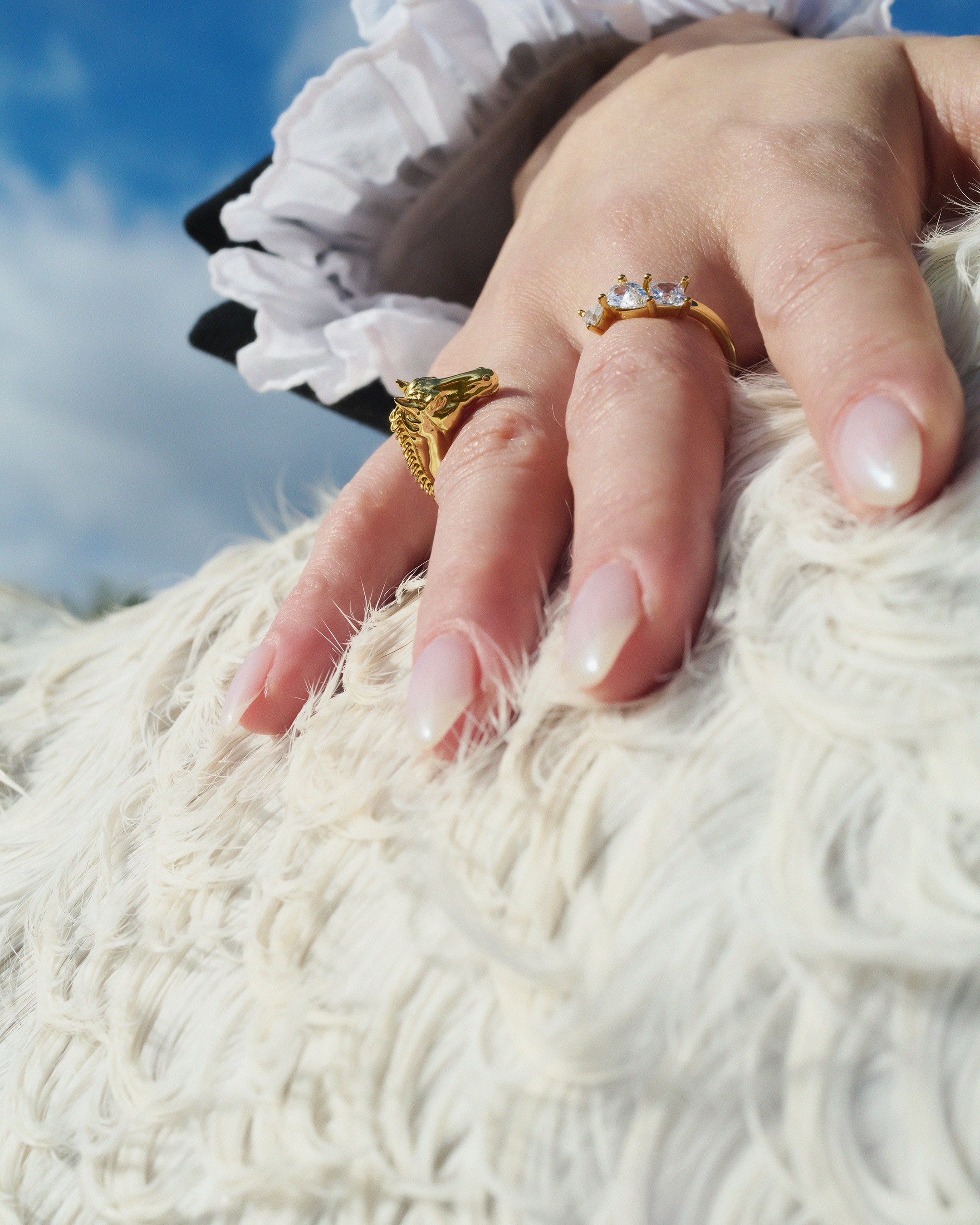 指に巻き付くような造形が印象的な、馬をモチーフにしたダブルフィンガーリング。反対側にはランダムな形のキュービックジルコニアをセッティングし、シャープさの中に華やかさをプラスしました。馬のたてがみは、連なりのあるディテールで毛並みを表現。力強さとしなやかさを併せ持つデザインが、スタイリングに存在感を与えます。