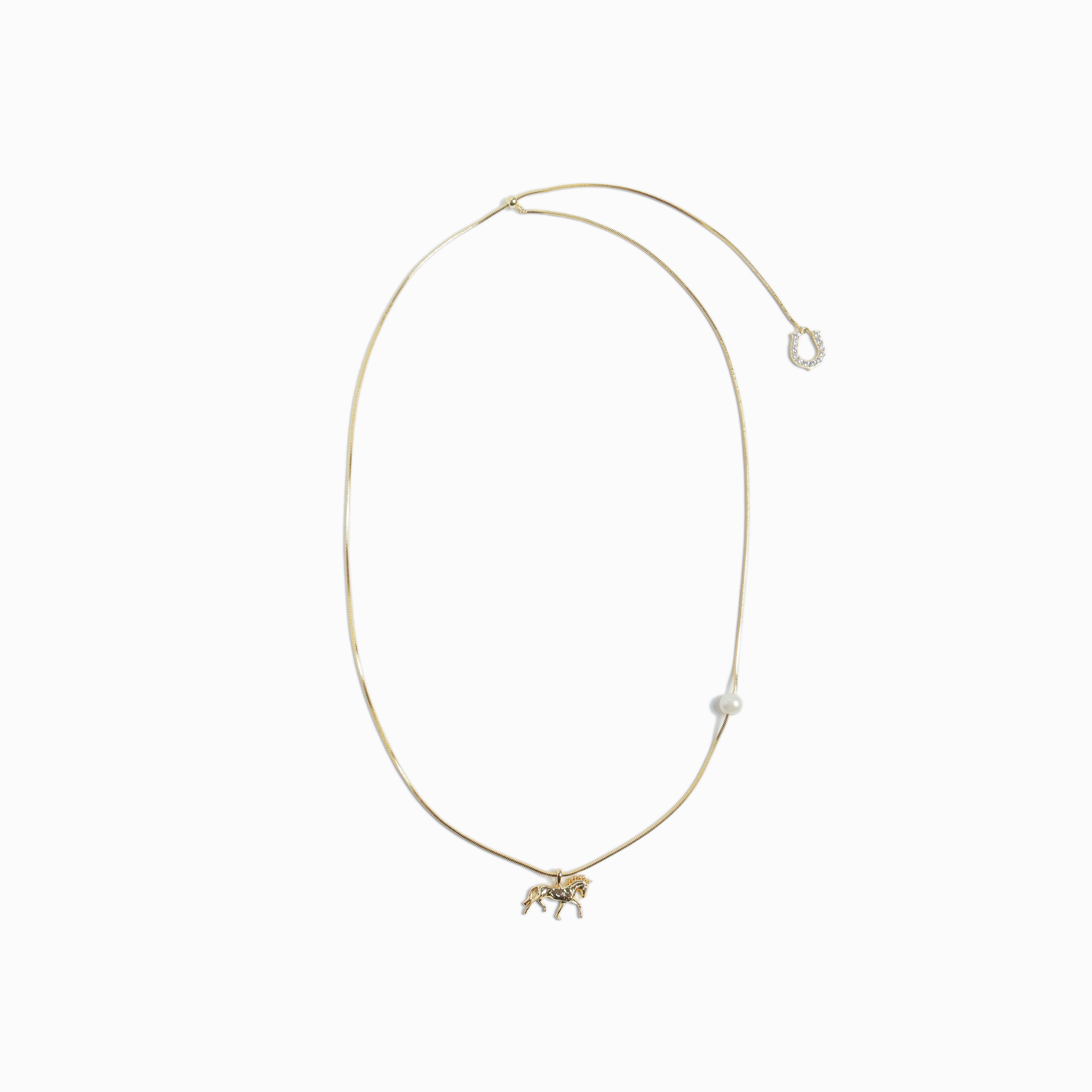 淡水パールと馬モチーフを組み合わせたロングネックレス。長さを調整できるデザインで、レイヤードスタイルも楽しめます。エンド部分にはキュービックジルコニアをあしらった馬蹄モチーフを配し、Y字ネックレスとしても着用できるマルチウェイ仕様です。