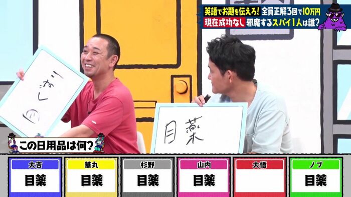 ここでは、最初の問題で早々に「相撲」と間違えたヒコロヒーさん、「ジョーカー」を言わなかった大悟さん、お題「お好み焼き」に対して「キャベツ」「シュリンプ」しか言えなかったノブさんがスパイ容疑者となりました。